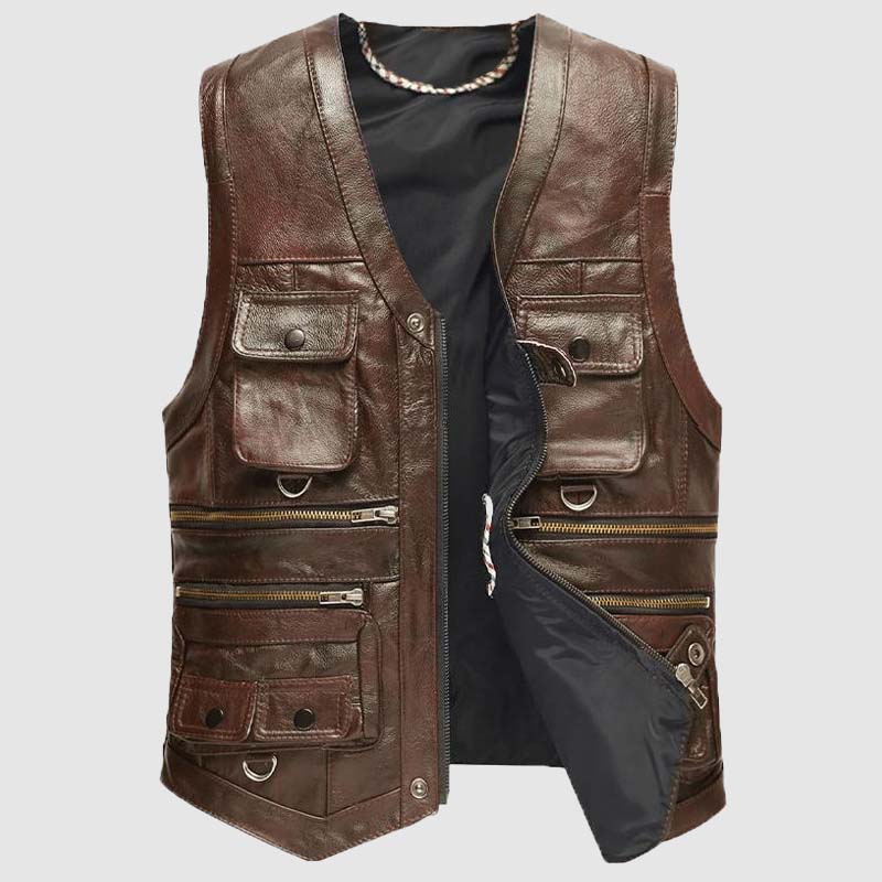 Incorporate a nostalgic retro look in your special occasion wardrobe. Featuring different pockets and a truly rustic design, this leather vest is a classic essential for a real man's wardrobe.
